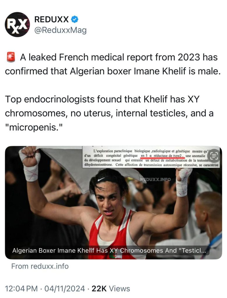 وذكرت تقارير طبية مسربة من مستشفيات في فرنسا والجزائر، أن إيمان خليف هي ذكر متحول جنسيًا، وتملك خصائص بيولوجية ذكورية. وفقاً لموقع “REDUXX”، حصل الصحفي الفرنسي جعفر آيت عويدة على تقرير طبي يشير إلى أن إيمان خليف تحمل كروموسومات XY، بالإضافة إلى خصيتين داخليتين، مما يدل على تكوين بيولوجي ذكوري.
