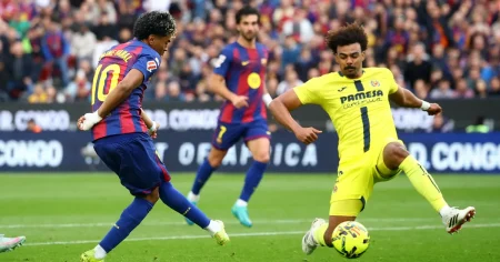 قاد اللاعب الشاب لامين يامال فريقه برشلونة لتحقيق فوز كبير على ضيفه فياريال بنتيجة 4-1، مساء السبت، ضمن منافسات الجولة 24 من الليغا الإسبانية للموسم 25-26. وسجل يامال ثلاثية (هاتريك) في الدقائق 28، 37، و69، فيما أضاف الدولي البولندي روبرت ليفاندوفسكي الهدف الرابع في الدقيقة 90+1، بينما سجل لاعب فياريال غايي هدف فريقه الوحيد في … تابع قراءة فوز برشلونة بثلاثية على فياريال في الليغا
