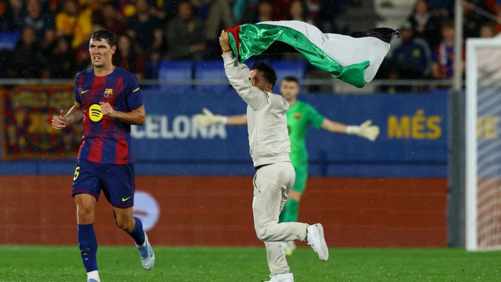 شهدت مباراة برشلونة ضد خيتافي في الدوري الإسباني حدثًا لافتًا بعد أن اقتحم أحد المشجعين ملعب يوهان كرويف حاملًا علم فلسطين، وذلك بالتزامن مع تسجيل برشلونة هدفه الثالث في الدقيقة 62، ورغم الاقتحام، رفض الحكم إيقاف اللعب، لتستمر الهجمة التي قادها ماركوس راشفورد ومرر خلالها الكرة إلى داني أولمو الذي وضعها في الشباك، لينتهي اللقاء بفوز برشلونة بثلاثية نظيفة.